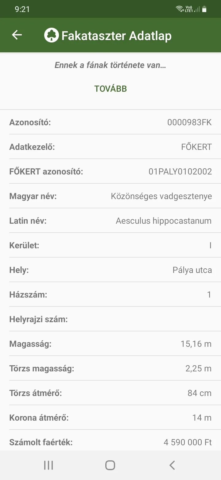 A mobil applikációból megtudható az előttünk álló fa adatain túl már sok esetben az értéke is. Egy fának persze elsősorban eszmei, érzelmi, környezetvédelmi értéke van. De létezik egy matematikai módszer arra is, hogy konkrét összeget rendeljünk egy-egy fához. Fontos azonban megjegyezni, hogy ezzel nem a fa árát, hanem az értékét fejezik ki. Mégis forintban adják meg, hogy például jogi viták rendezéséhez segítséget nyújtson, és esetleges károkozáskor behajthassák azt az elkövetőn. A faérték számításnak hivatalos képlete van. Ez figyelembe veszi a fafajt, életkorát, elhelyezkedését és a városképi értékét. Ez az érték lesz az alapja annak a számításnak, hogy egy adott fát hány faiskolai csemetével tudnak pótolni, ha ki kell vágni, vagy komoly kárt szenved.