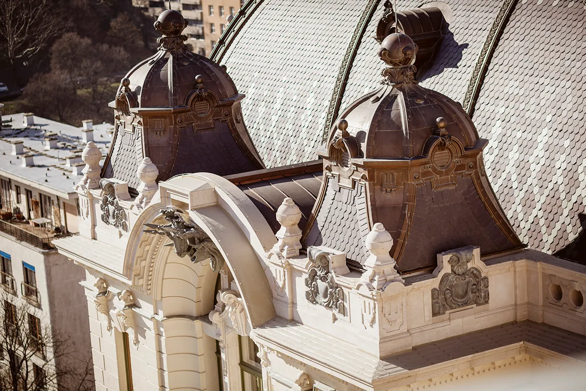 Az eredeti formájában újraalkotott impozáns, vörös és zöld angol palával fedett tető nemzetközi viszonylatban is egyedülálló értéket képvisel.