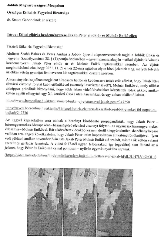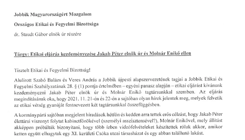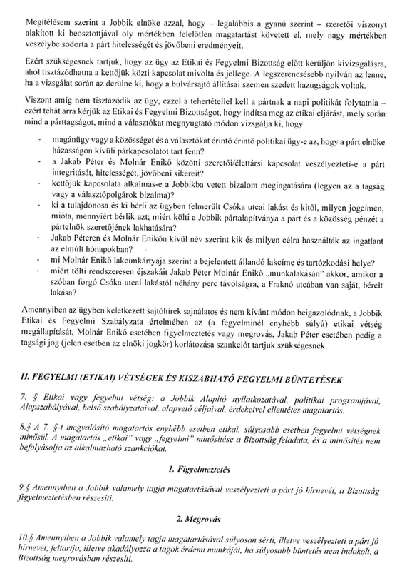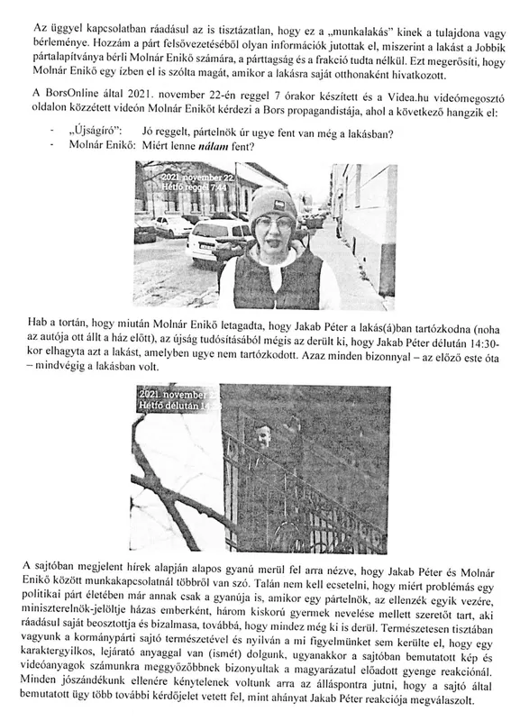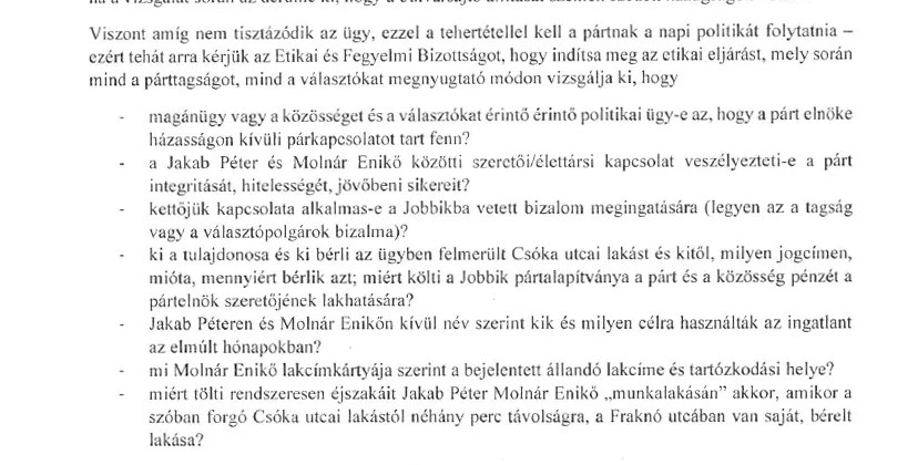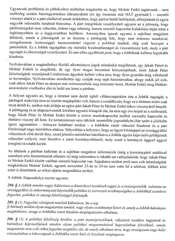 „A párttagság és az alapszervezetek körében hónapok óta, ha nem egy éve terjed az a szóbeszéd, hogy Jakab Péter és Molnár Enikő között a szoros munkakapcsolat mellett szexuális kapcsolat és élettársi viszony áll fenn.”