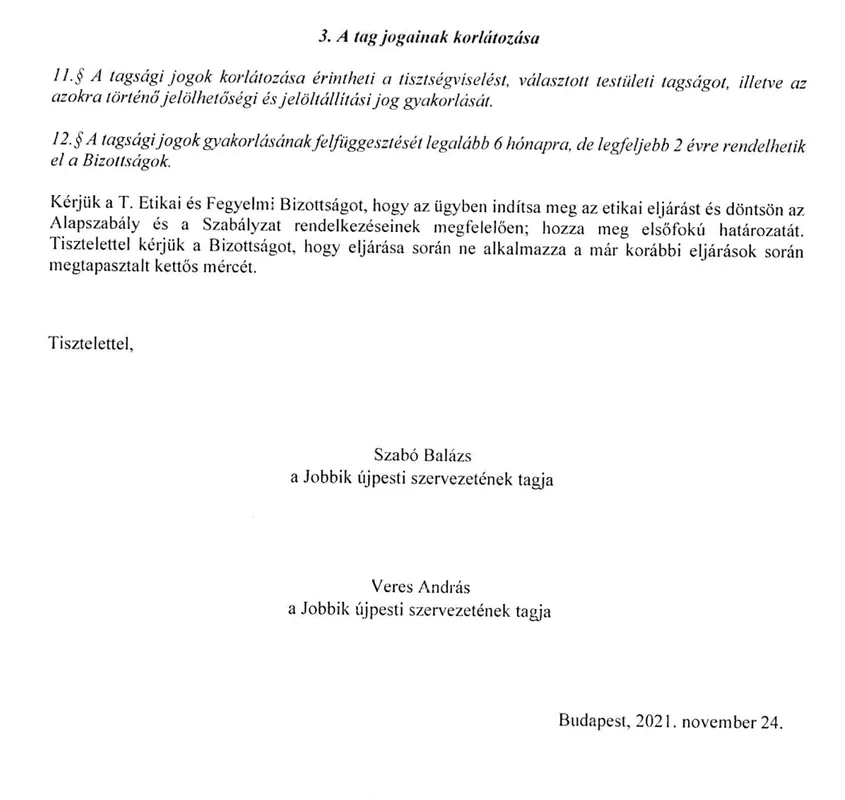A Bors megszerezte az etikai eljárást kezdeményező iratot, amit Szabó Balázs és Veres András, a Jobbik újpesti alapszervezetének tagjai írtak alá.