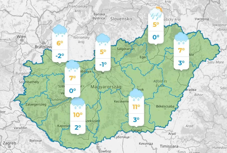 Szombaton erősen felhős, vagy borult lesz az ég. A délelőtti órákig délen esők, nyugaton havas eső, néhol ónos eső, az Alpokalján havazás is lehet. Napközben átmenetileg szakadozik a felhőzet, de estétől délnyugat felől újabb esők lehetnek. A délkeleti szél élénk lesz. Az Alpokalján lesz a leghidegebb, itt csak +1, +2 fok várható, máshol 3-11 fok között alakul a hőmérséklet.