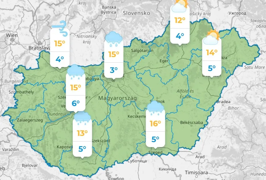 Erősen felhős vagy borult lesz az ég, és sokfelé várható eső, zápor, főleg keleten zivatar is kitörhet. Délután a csapadék súlypontja már keleten lesz, nyugaton felszakadozhat a felhőzet. Eleinte a DK-i, majd estétől az ÉNy-i szél erősödhet meg. Zivatarok környezetében viharos széllökések is lehetnek. Délkeleten akár 22-23 fok is lehet, északon 15 fok körüli értékeket mérhetünk.