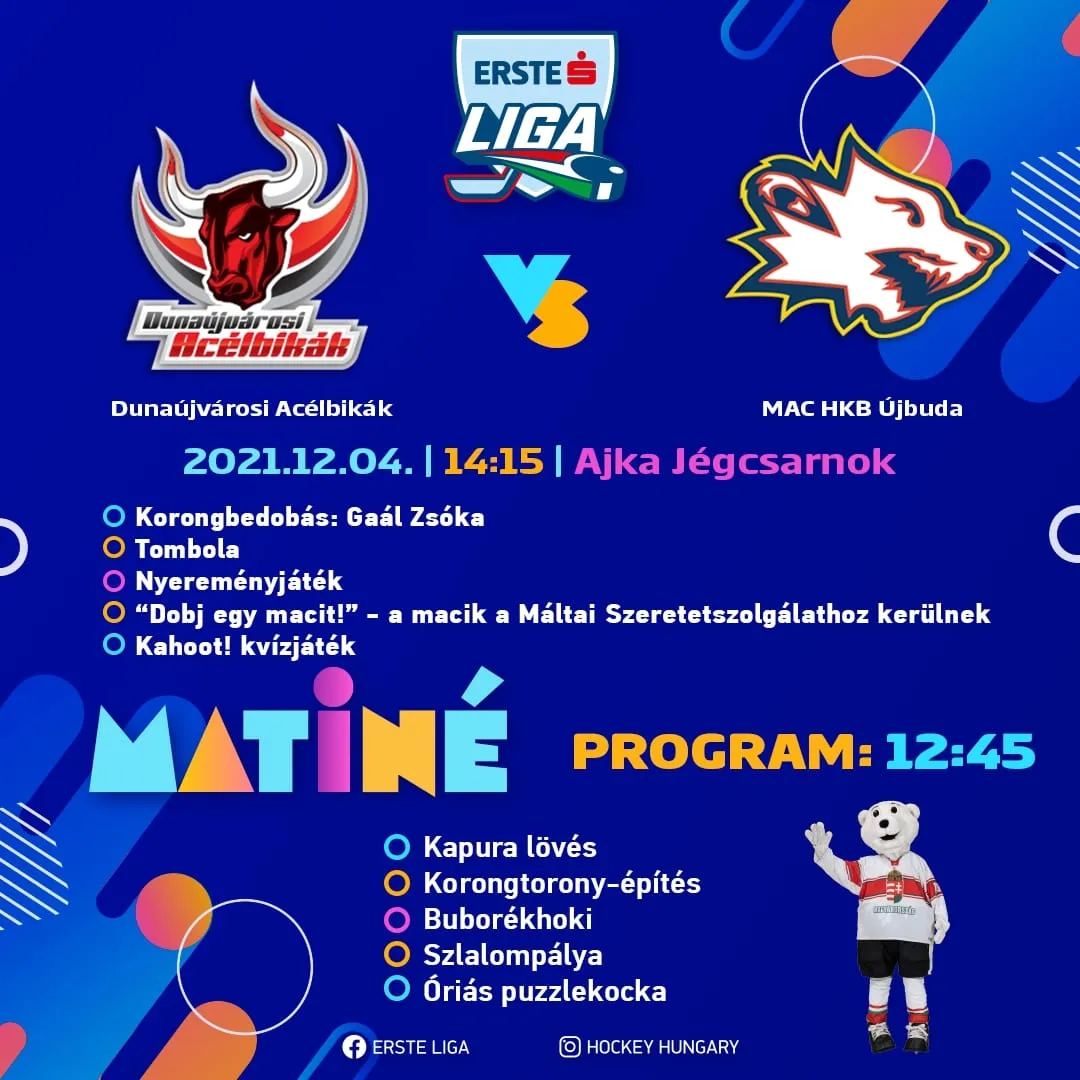 Ez az első alkalom, hogy Ajka városában hivatalos felnőtt bajnoki mérkőzést rendeznek. Az MJSZ közelmúltban indított új rendezvénysorozata, a magyar bázisú nemzetközi jégkorongbajnokság köré szervezett, nagy sikerű Erste Liga Matiné Újpesten startolt, majd Zalaegerszegen, Miskolcon, a Tüskecsarnokban és Debrecenben folytatódott, és most Ajkára érkezik. December 4-én szombaton 14:15-kor a Dunaújvárosi Acélbikák csapata a MAC HKB Újbudával csap össze, de a programok már a korongbedobás előtt másfél órával, 12:45-kor megkezdődnek.