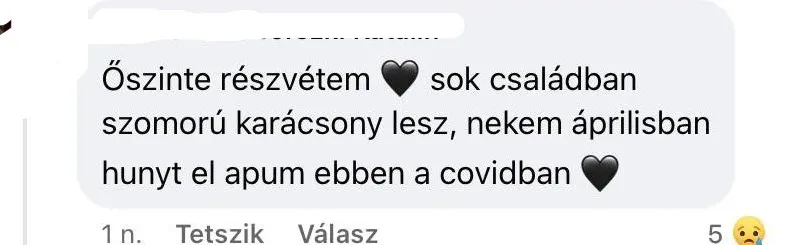 „Sajnos mi is így vagyunk, már 8 hónapja nem enyhül a fájdalom, szeretett édesanyám elvesztése után semmi sem lesz a régi, a karácsony sem. És sajnos még mindig van sok ember, aki ezt a vírust nem veszi komolyan.” – írta egy másik együttérző.