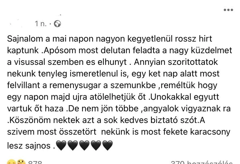 „Mély együttérzésem, az én anyukámmal is ez történt. Amikor hasra vagy oldalra fordították, akkor javultak az értékek, aztán csökkentették az oxigént és 2 nap múlva összeomlott a szervezete. Itt hagyott minket karácsony előtt, nekünk is fekete lesz a karácsonyunk” – osztotta meg saját történetét Csilla.