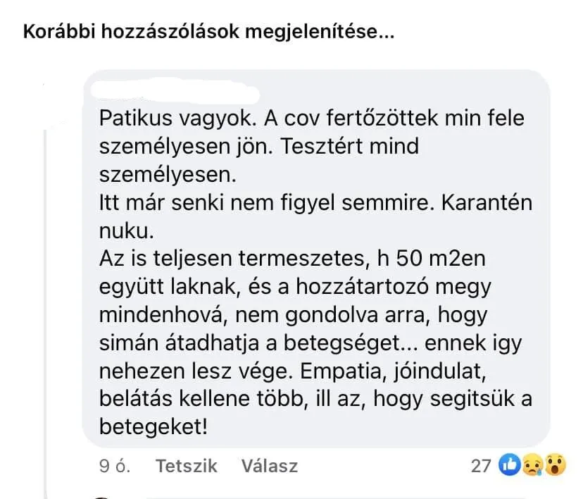 „Itt már senki nem figyel semmire, karantén nuku... ennek így nehezen lesz vége. Empátia, jóindulat, belátás kellene több, illetve az, hogy segítsük a betegeket” – tette hozzá.