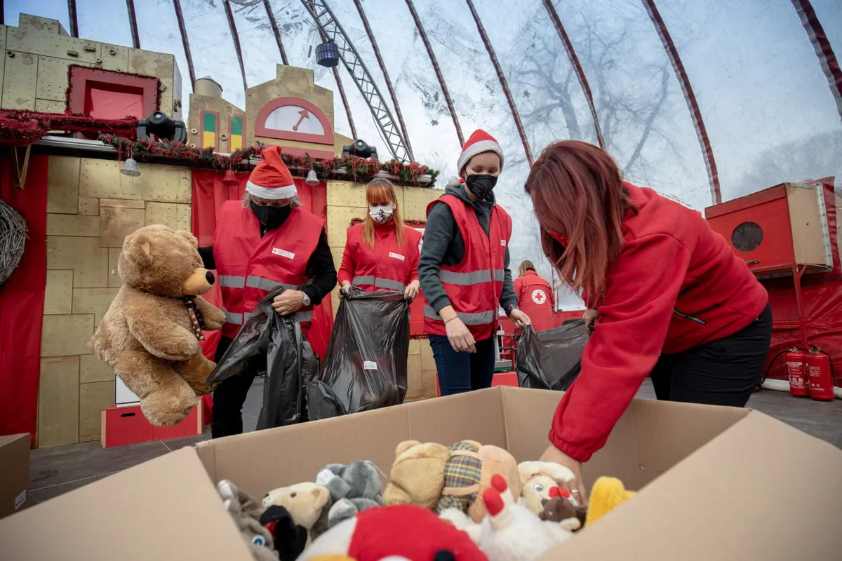 Önkéntes munkatársak adományokat válogatnak a Mikulásgyár megnyitásán a Városligetben 2021. december 1-jén.