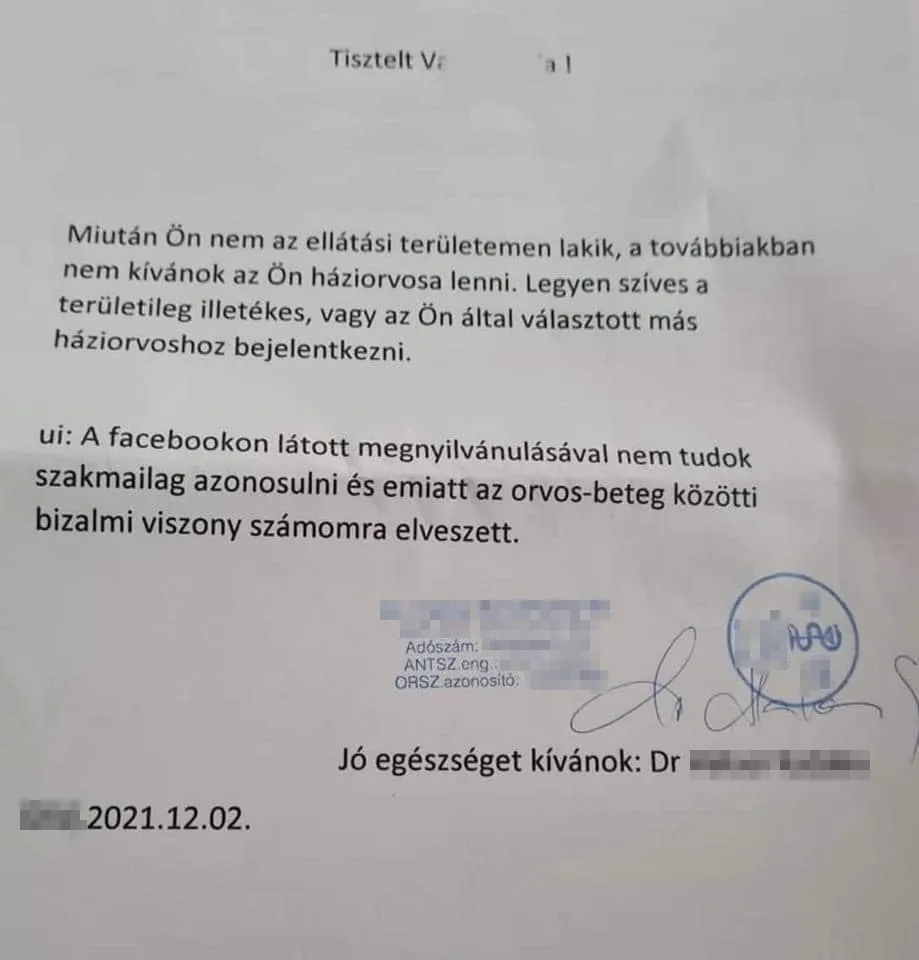 Csakhogy kiderült: a pecséten szereplő doktornő már nem praktizál, 2021-es keltezéssel nem is írhatott hivatalos levelet. A régi pecsétjét vagy egy igazolását felhasználva kreáltak egy hamis levelet.