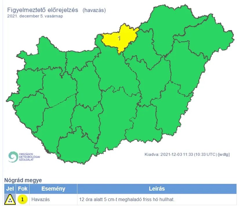 Havazás miatt elsőfokú riasztást adtak ki 2021. december 5-ére, vasárnapra Nógrád megyére – olvasható az Országos Meteorológiai Szolgálat honlapján.