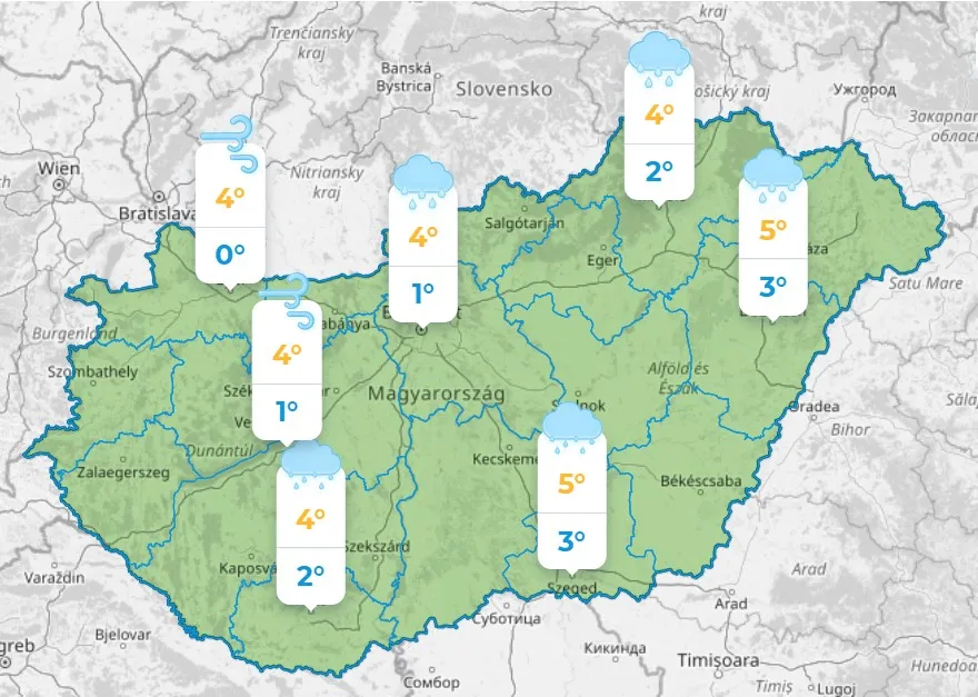 Pénteken a délelőtti órákig a Tisza vonalában lévő összeáramlási zóna mentén még előfordul havas eső, hózápor, majd ott is csökken a felhőzet, és az ország nagy részén több órára kisüt a nap. Főleg a nap első felében lesz még erős az északnyugati szél. Reggel 0, délután +4°C körül alakul a hőmérséklet.