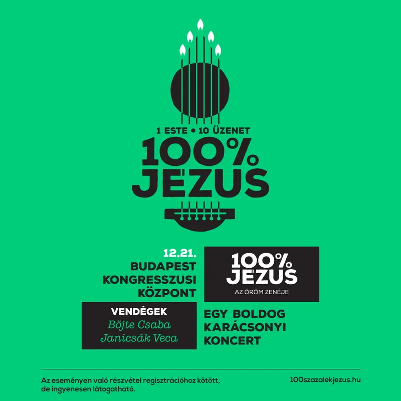 100% Jézus címmel szerveznek dicsőítő karácsonyi koncertet december 21-én, kedden 20 órakor a Budapest Kongresszusi Központban.