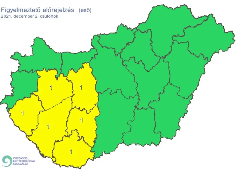 A figyelmeztető előrejelzés szerint a délutáni, esti óráktól elsősorban a magasabban fekvő hegyvidéki területeken (Alpokalja, Északi-középhegység) válthat át az eső havas esőre, havazásra.