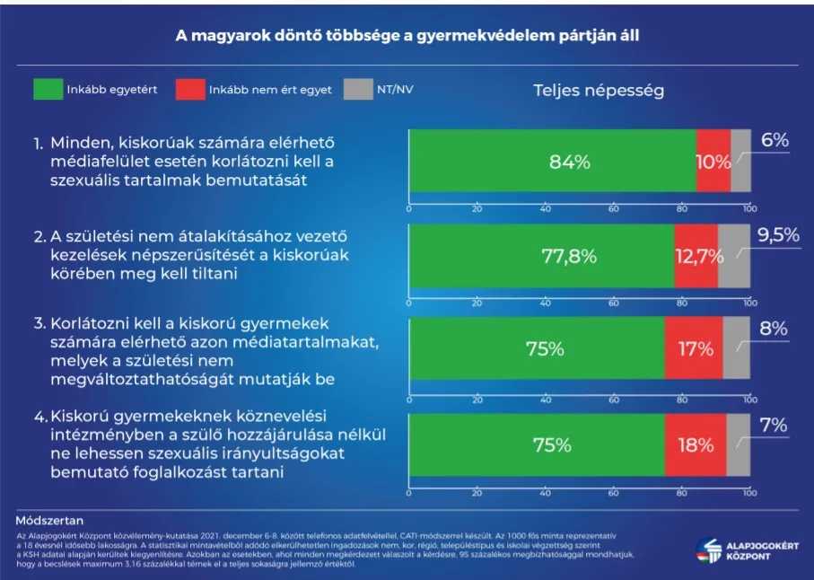 Az országosan reprezentatív kutatás adataiból kiderül, hogy 2021. december elején a választókorú magyar lakosság háromnegyede – hatmillió fő – egyetért a kormánypártok által kezdeményezett gyermekvédelmi népszavazás legfontosabb kérdéseivel, ami annak köszönhető, hogy még a kormányfővel szemben kritikusok többsége is osztja a gyermekvédelem kapcsán a jobboldal álláspontját.