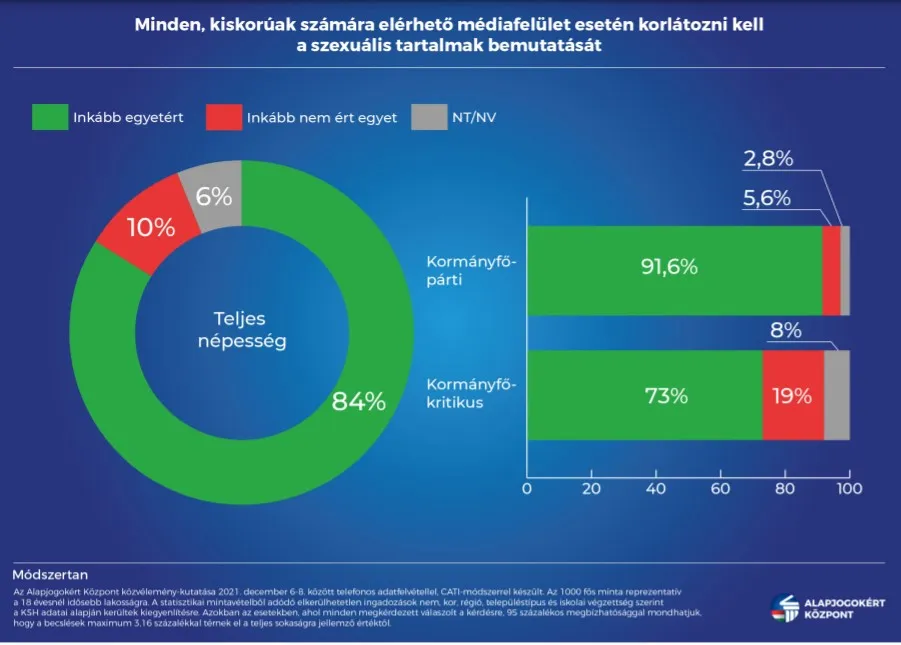 A legnagyobb mértékű konszenzus abban alakult ki a magyarok között, hogy a szexuális tartalmak elérhetőségét korlátozni lehessen. A megkérdezettek 84 százaléka egyetértett ebben a tekintetben a kormánypártok álláspontjával, miszerint a 18 év alattiak számára elérhető médiafelületeken korlátozni kell a szexuális tartalmak bemutatását.