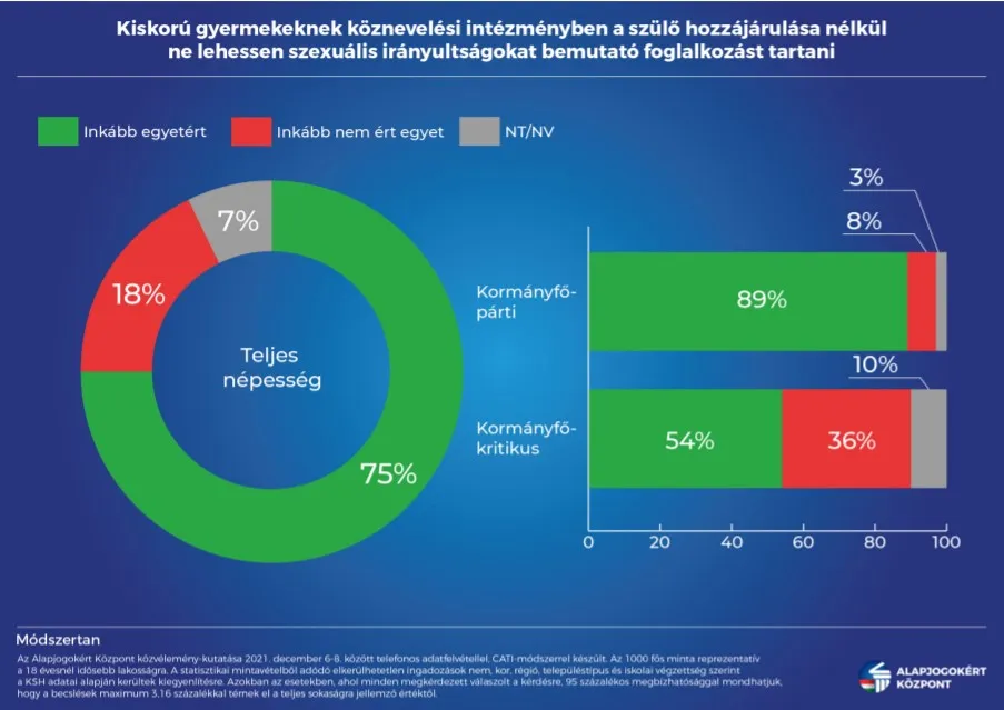 Szintén a felnőtt magyarok háromnegyede (75 százalék) helyezkedett arra az álláspontra, hogy a szülő hozzájárulása nélkül szexuális irányultságokat bemutató foglalkozást ne lehessen tartani kiskorú gyermekeknek köznevelési intézményben, és mindössze 18 százalékuk gondolkozott ezzel ellentétesen.