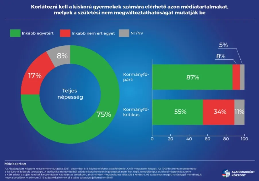 A felnőtt magyar lakosság túlnyomó többsége, 84 százaléka korlátozná a szexuális tartalmak bemutatását a 18 év alattiak számára a médiafelületeken, 78 százalékuk pedig megtiltaná a körükben a nemük átalakításához vezető kezelések propagálását is.