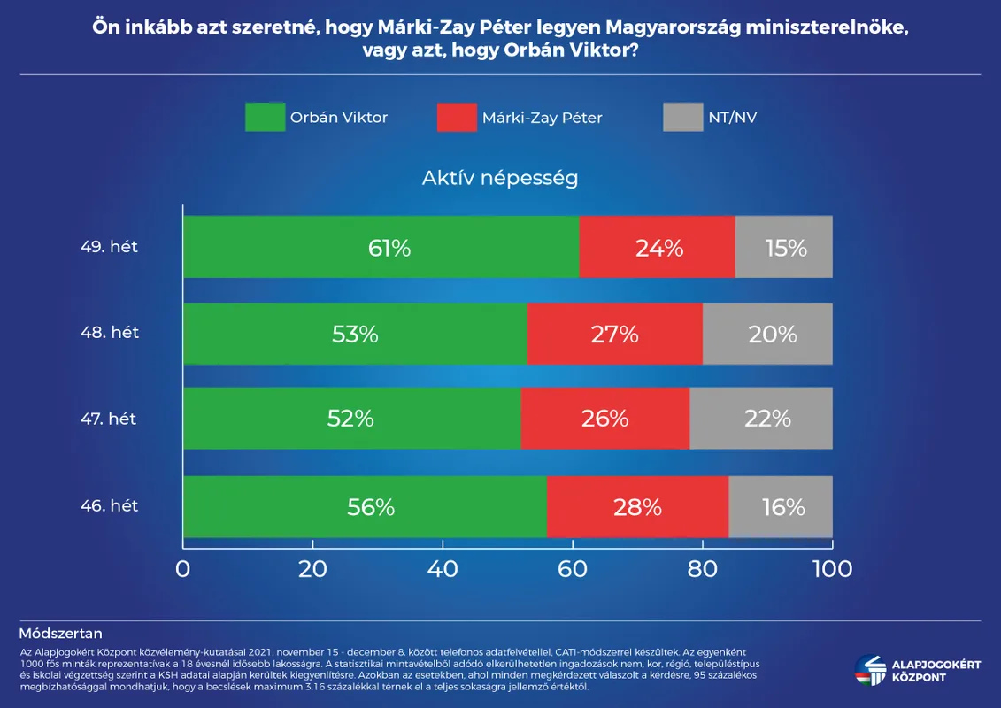 Az országosan reprezentatív kutatások november 15-e és december 8-a közötti időszakban mérték fel azt, hogy Orbán Viktort, illetve Márki-Zay Péter baloldali miniszterelnök-jelöltet az aktív szavazók hány százaléka szeretné kormányfői pozícióban látni. Valamennyi mérés azt mutatja, hogy a megkérdezettek abszolút többsége a Fidesz elnöki tisztségét betöltő Orbán Viktort szeretné a jövőben is miniszterelnöknek.