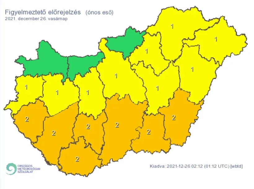 Zala, Somogy, Tolna, Baranya, Bács-Kiskun, Csongrád-csanád és Békés megyékben másodfokú riasztást, még Szabolcs, Borsod-Abaúj-Zemplén, Hajdú-Bihar, Jász-Nagykun-Szolnok, Heves, Pest, Fejér, Veszprém és Vas megyékben elsőfokú riasztás van érvényben.