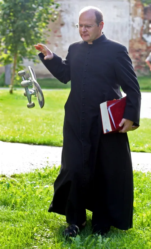 Lendvai Zoltán plébános ledobja gördeszkáját a gáborjánházi templom elõtt.