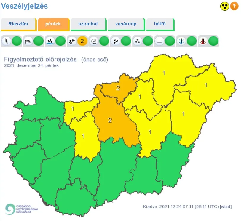 Ez azt jelenti, hogy több órán át tartó ónos esőre lehet számítani a fenti két megyében és a várt csapadékmennyiség meghaladhatja az 1 mm-t. Mindez fokozott balesetveszélyt jelenthet december 24-én, küklönösen azoknál, akik az utolsó pillanatra hagyták a karácsonyi nagybevásárlást, illetve ajándékbeszerzést és autóba szállva, sietve igyekeznek elintézni az ünnepi teendőket.