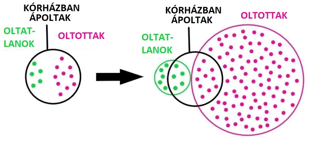 Ez az ábra azt mutatja be, hogy mennyire hamis lehet egy olyan állítás, hogy „nem működik az oltás, hiszen a kórházban lévők kétharmada oltott”.