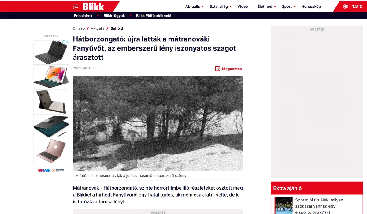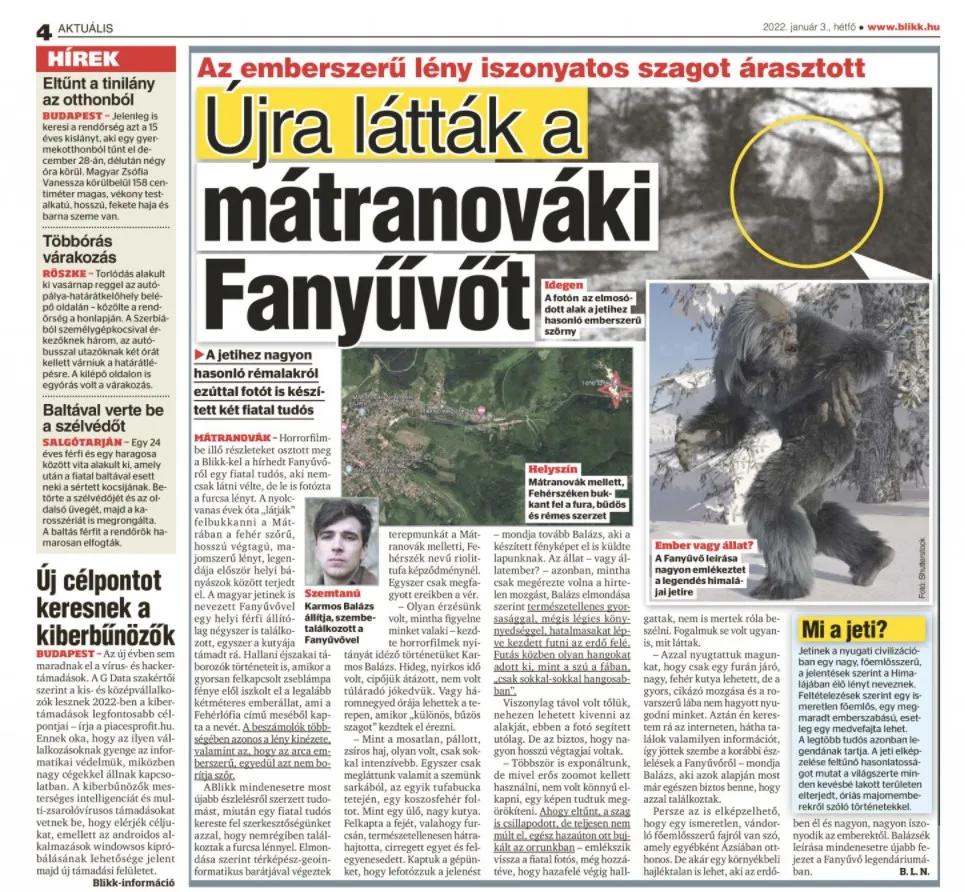 Alig egy hét telt el 2022-ből, de máris megvan az év átverése! Mindez a Blikk szerkesztőségének köszönhető, ugyanis a következő, véresen komoly címmel ellátott cikkükkel sikerült ledobniuk az atombombát január 3-án: Hátborzongató: újra látták a mátranováki Fanyűvőt, az emberszerű lény iszonyatos szagot árasztott.