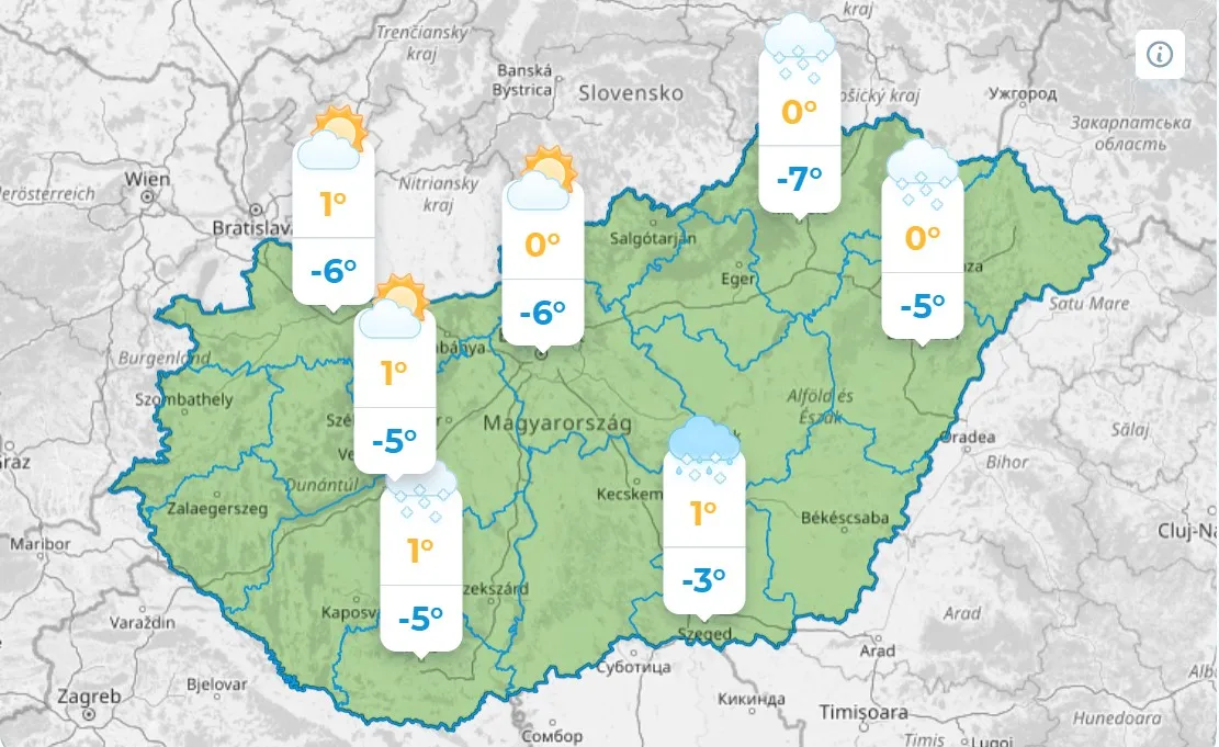 A hőmérséklet nem változik jelentősen az előző napokhoz képest: a fagyos reggel után -1, +2 fok közé melegszik a levegő. Budapesten -5 fokkal indul a reggel.