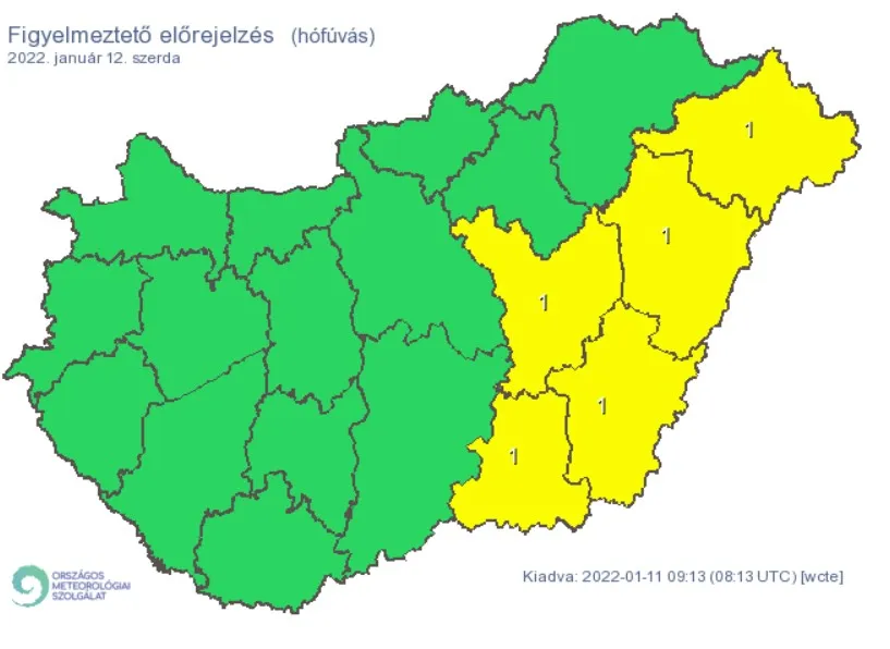 Szerdára hófúvás miatt adtak ki riasztást Békés megyére, Csongrád-Csanád megyére, Hajdú-Bihar megyére, Szabolcs-Szatmár-Bereg megyére, és Jász-Nagykun-Szolnok megyére.