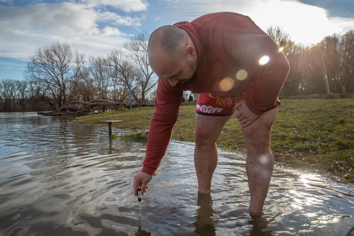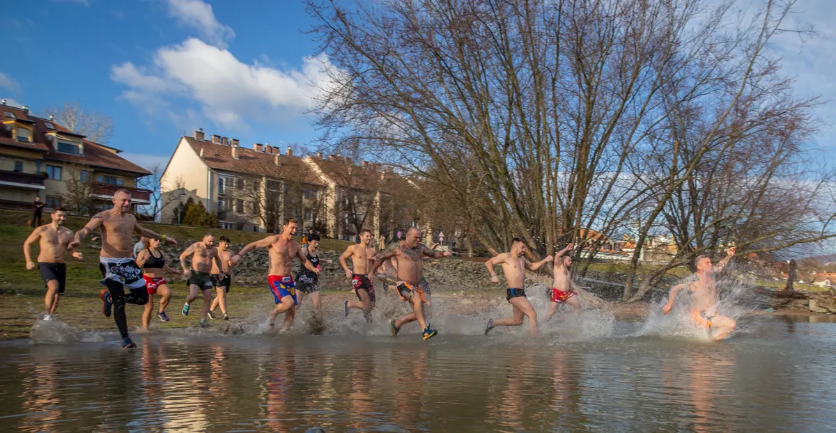 Tucatnyi nekivetkőzött sportember tette próbára magát 2022 első napján Szentendrén, a Duna partján. Megpróbáltak a víz felszínén átrohanni a túlpartra, ami, mint eddig, ma sem sikerült, ám egy kiadós fürdés mindenkinek jutott az 5,6 fokos vízben.