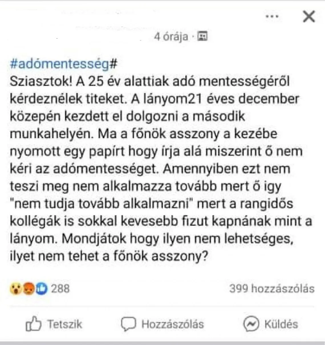 Elképesztő történetet osztott meg egy anyuka az egyik Facebook-csoportban. A nő 21 éves lánya furcsa helyzetbe került a munkahelyén a 25 év alattiak szja-mentessége kapcsán.