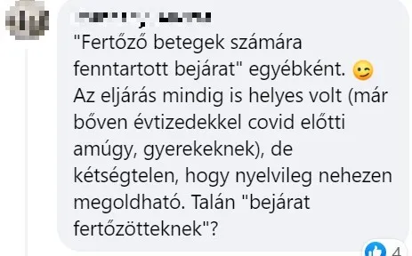 Szintén kérdéseket vet fel az ajtón található felirat. Nyilvánvalóan nem a bejárat fertőző, hanem azoknak kell itt bemenniük, akik fertőzöttek, valóban szerencsésebb – és magyarosabb – lett volna tehát a „bejárat fertőzötteknek” felirat.