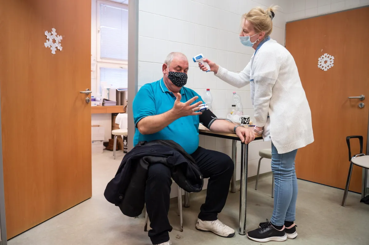 Megmérik egy férfi testhőmérsékletét, vérnyomását és véroxigénszintjét, mielőtt beoltották a német-amerikai fejlesztésû Pfizer-BioNTech koronavírus elleni oltóanyag, a Comirnaty-vakcina harmadik, emlékeztető adagjával a salgótarjáni Szent Lázár Megyei Kórház oltópontján 2022. január 2-án.