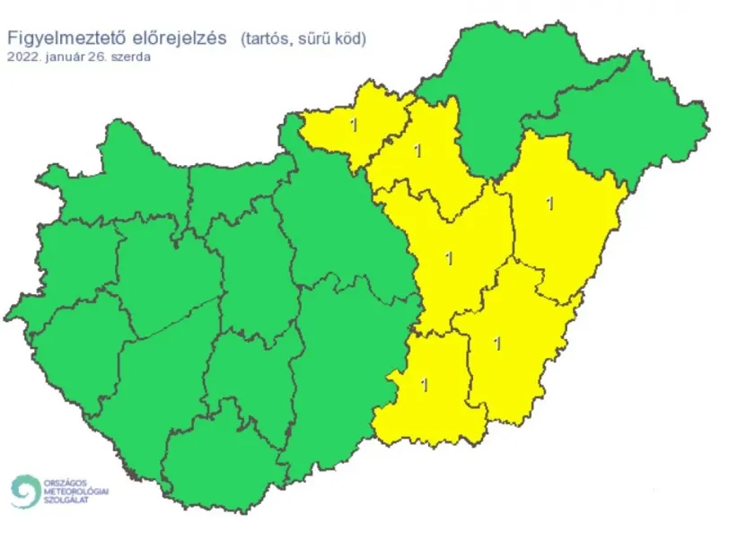 Az OMSZ riasztása szerint hat megyében adtak ki riasztás sűrű köd miatt Az érintett területek: Békés, Csongrád-Csanád, Hajdú-Bihar, Heves, Nógrád és Jász-Nagykun-Szolnok megye.