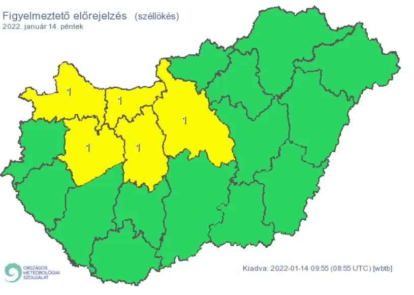 Elsőfokú, citromsárga riasztást adott ki az erős szél veszélye miatt az Országos Meteorológiai Szolgálat. Mint írják, az Észak-Dunántúlon és a főváros tágabb térségében (főként a magasabban fekvő területeken) viharos (~60-80 km/h-s) széllökések is kísérhetik az északnyugati szelet. A szombatra virradó éjszaka fokozatosan veszít erejéből a légmozgás.