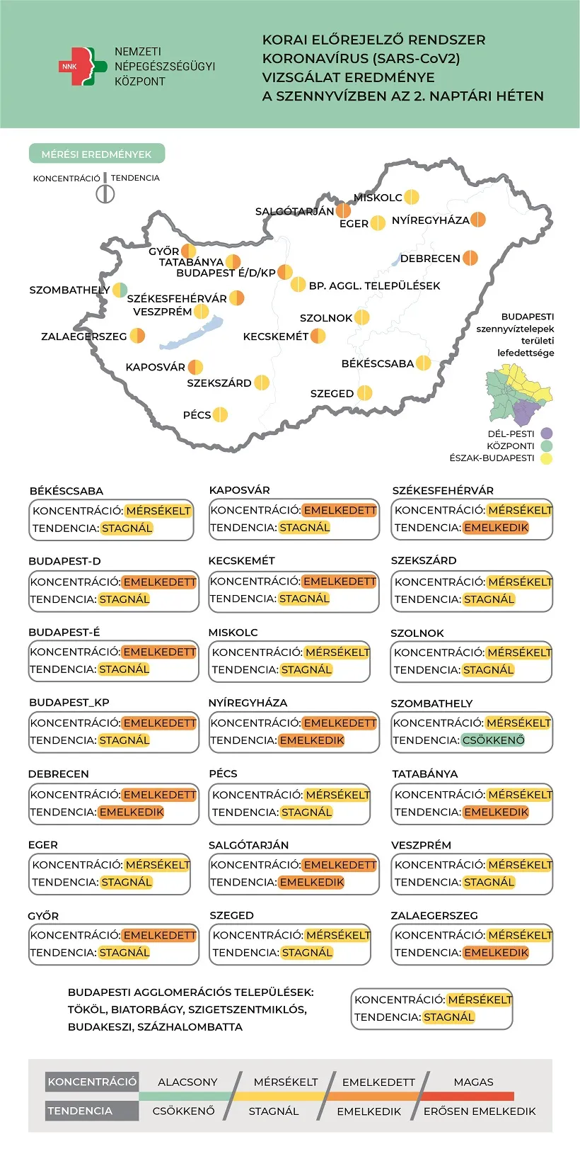 „A szennyvíz SARS-CoV-2 örökítőanyagának koncentrációja országos átlagot tekintve ismét enyhe emelkedést mutat. A vizsgált városok közül emelkedő tendencia Debrecen, Nyíregyháza, Salgótarján, Székesfehérvár, Tatabánya és Zalaegerszeg esetében látható, míg Szombathelyen enyhe csökkenés tapasztalható. A SARS-CoV-2 örökítőanyag koncentráció 13 mintavételi helyen a mérsékelt, míg 9 településen az emelkedett kategóriába sorolható„ – olvasható a kiadott közleményben.