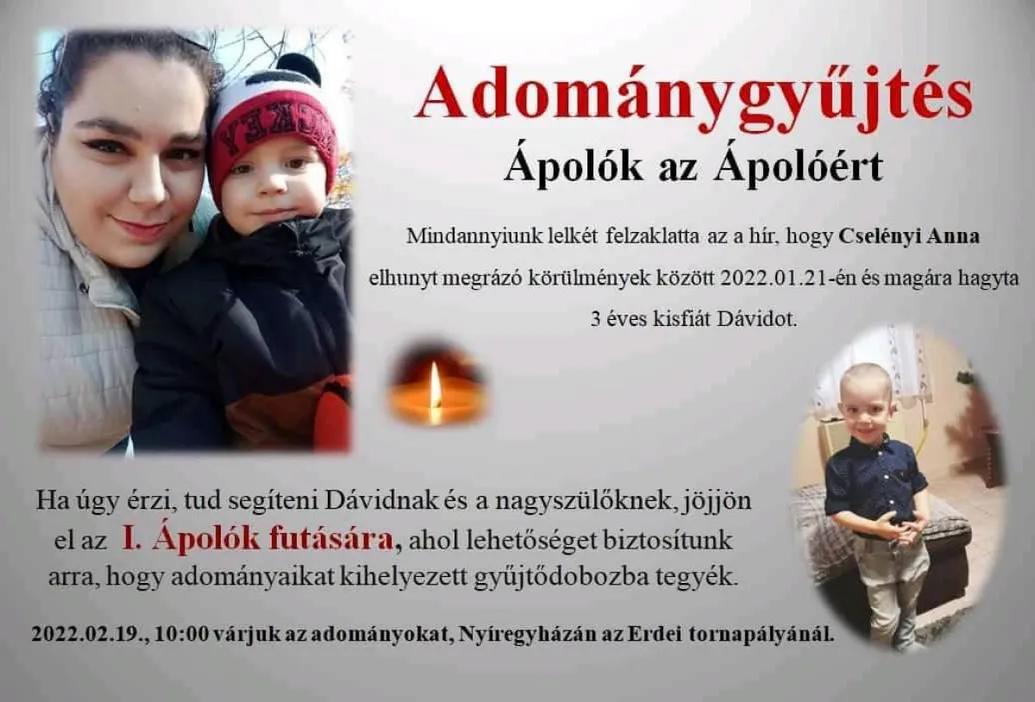 A 3 éves kisfia, Dávid árva lett – a nagyszülők vigyáznak most rá. Az ismerősök megpróbálnak segíteni a nagyszülőknek, ezért adomány gyűjtést szerveznek. Az Ápolók futásán lehetőséget biztosítanak az adományozásra. Aki nem tud részt venni az eseményen, az ide kattintva tájékozódhat az adományozási lehetőségekről.