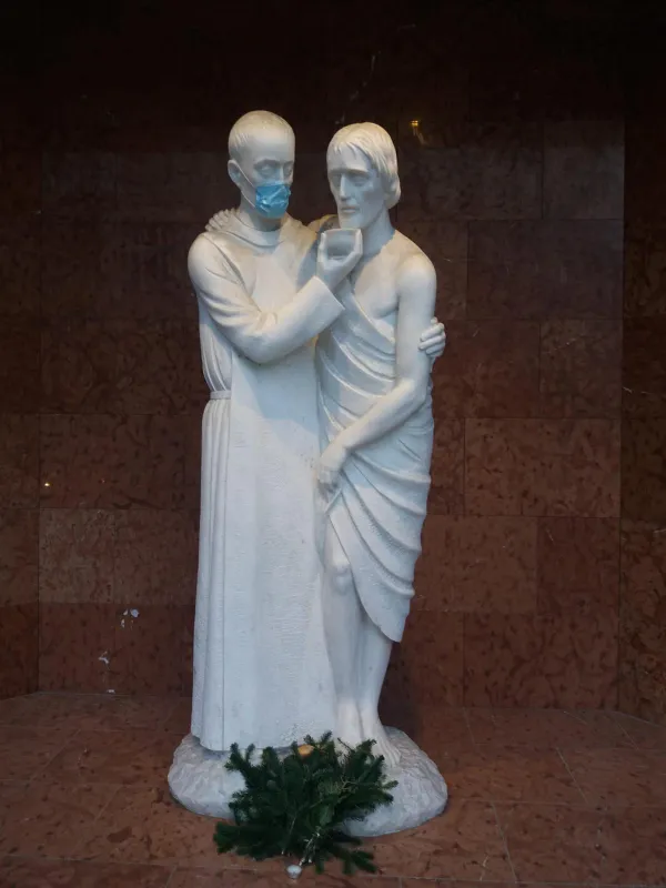 A fotón látható ókori, klasszikus férfimodellt idéző szobor egyik tagja is elkötelezett maszkviselő, és bizony még szabadtéren is odafigyel a megfelelő védekezésre.