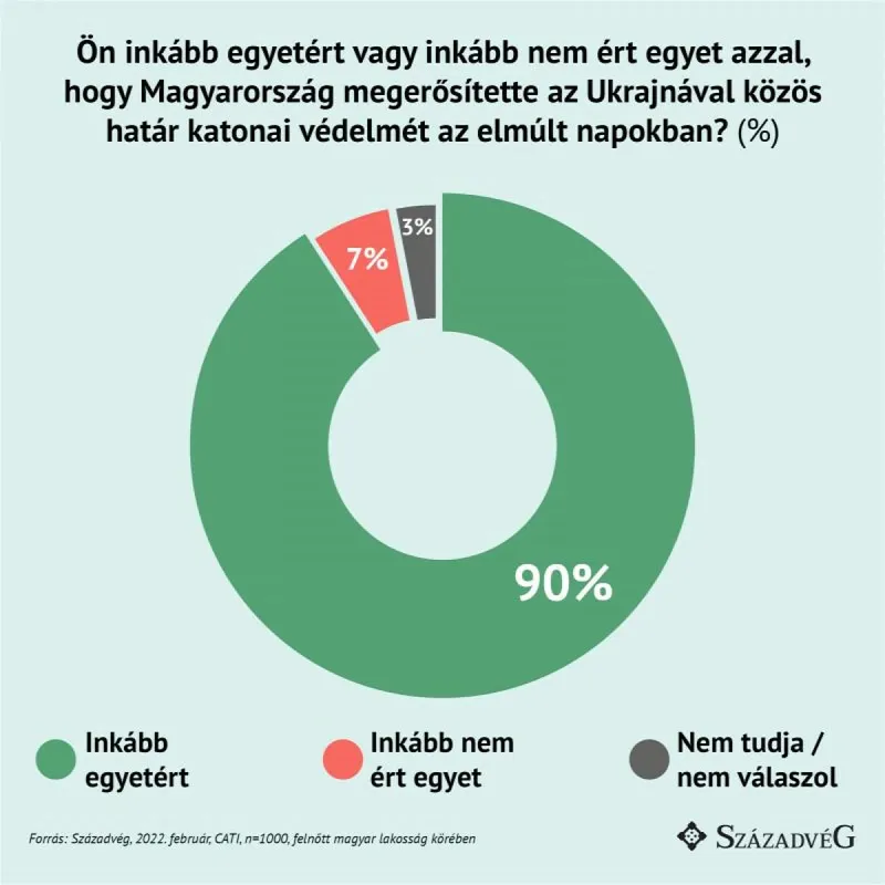 Ehhez kapcsolódóan fontos hangsúlyozni, hogy a magyarok 90 százaléka egyetért azzal, hogy hazánk az elmúlt napokban megerősítette a magyar-ukrán határ katonai védelmét, ugyanakkor 7 százalékuk ellenzi ezt az intézkedést.