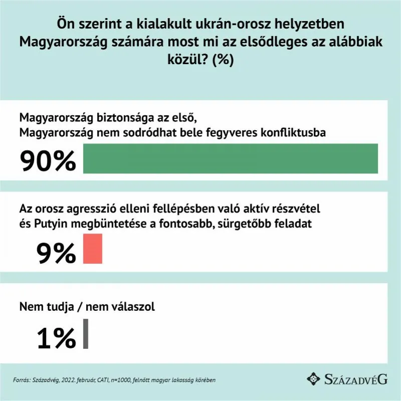 Megállapítható, hogy a magyarok elsődleges fontosságúnak ítélik hazánk biztonságának szavatolását. A kutatás rámutat, hogy 10-ből 9 válaszadó (90 százalék) szerint Magyarország biztonsága az első, továbbá kulcsfontosságú, hogy hazánk ne sodródjon fegyveres konfliktusba, ezzel szemben a megkérdezettek 9 százaléka az orosz agresszió elleni fellépésben való aktív részvételt, valamint Vlagyimir Putyin orosz elnök megbüntetését tartja fontosabb, sürgetőbb feladatnak.