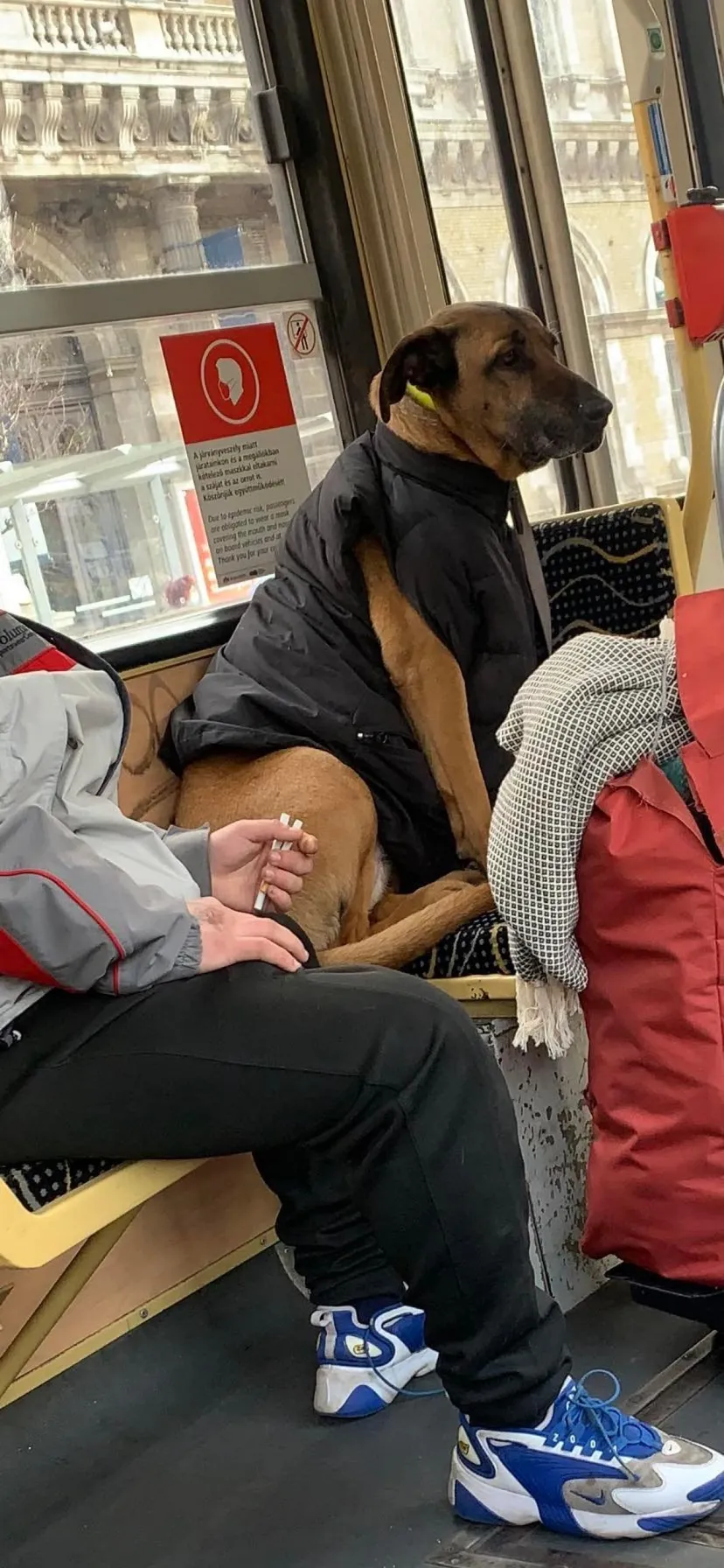 A fotó a 47-es villamoson készült a Fővám térnél, de ki tudja talán más járatokon is feltűnik majd az egészen emberi vonásokat öltő kutyus és gazdája a közeljövőben.