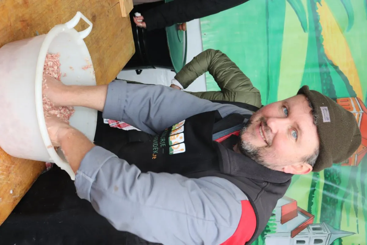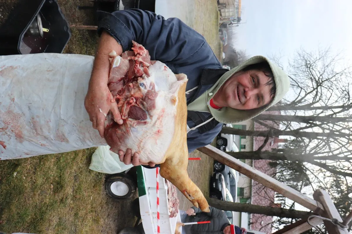 Papp Róbert, a Vönöcki csapat böllére törött bordával versenyzett. „Ha munka van, hát munka van”, mondta, egy hátsó sonkával a kezében.
