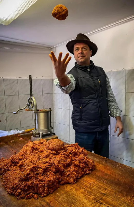 A muravidéki csapat fehér kolbászt töltött, versenyzőjük itt fűszerezi-gyúrja az alapanyagot.