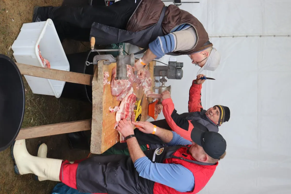 A hentesek asztalára már nagyobb darabokban kerül az állat, itt dolgozzák fel a húst A kolbásztöltelékhez összekockázzák és ledarálják a belevalót.