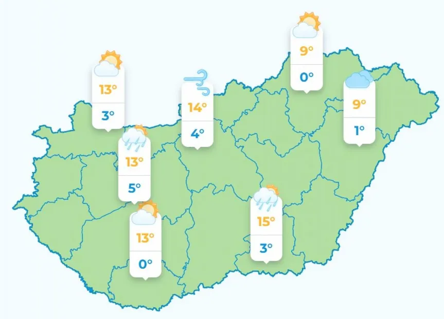 Délelőttől kezdve jelentősen csökken nyugat felől a felhőzet, egyre nagyobb területen lesz napsütés. Délelőtt még élénk lesz az északnyugati szél. 9 és 15 fok közötti kora tavaszi időre számíthatunk.