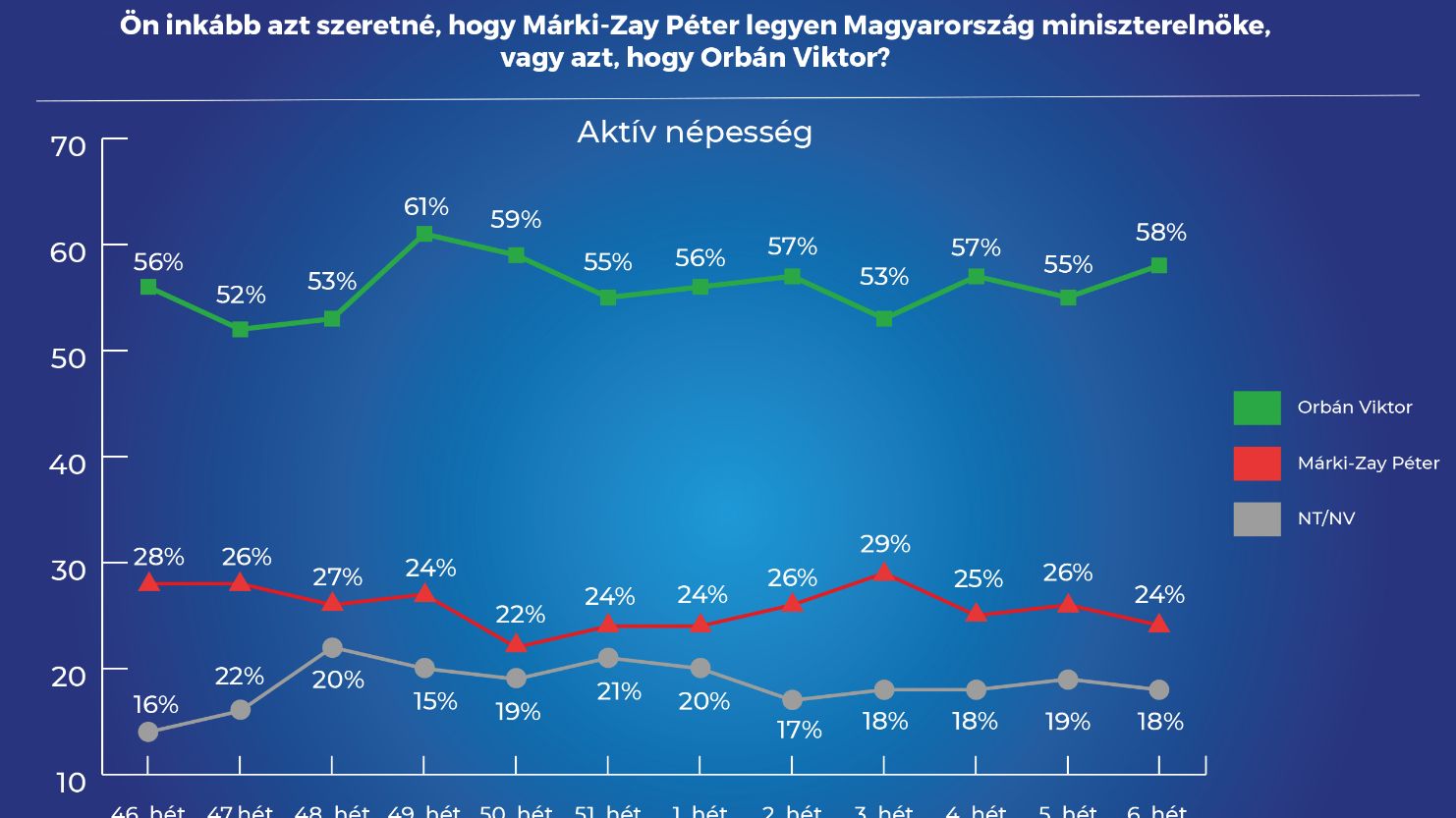A 2010 óta hivatalban lévő kormányfő népszerűsége továbbra is töretlen: a mögöttünk hagyott 12 hétben 52-61 százalék között mozgott az őt támogató, aktív megkérdezettek aránya – ez most 58 százalék.