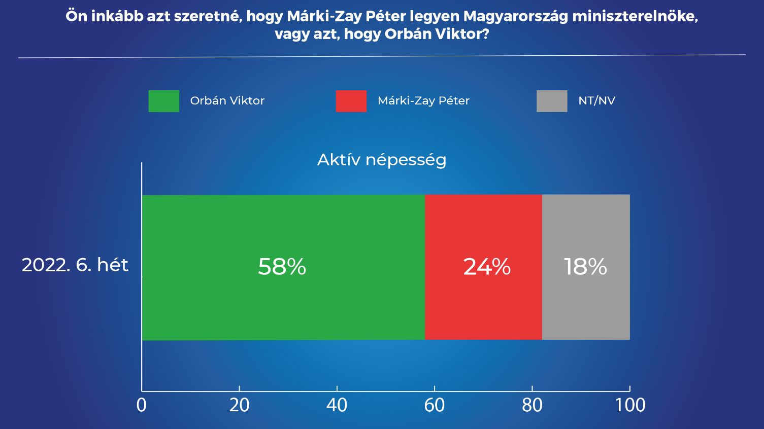 Az országosan reprezentatív kutatások 2021 utolsó hat, illetve 2022 első hat hetében mérték fel azt, hogy Orbán Viktor miniszterelnököt, illetve Márki-Zay Péter baloldali miniszterelnök-jelöltet az aktív szavazók hány százaléka szeretné kormányfői pozícióban látni. A kutatási trendek azt mutatják, hogy a válaszadók rendre abszolút többséget meghaladó arányban mondták azt, hogy Orbán Viktort szeretnék miniszterelnöknek.