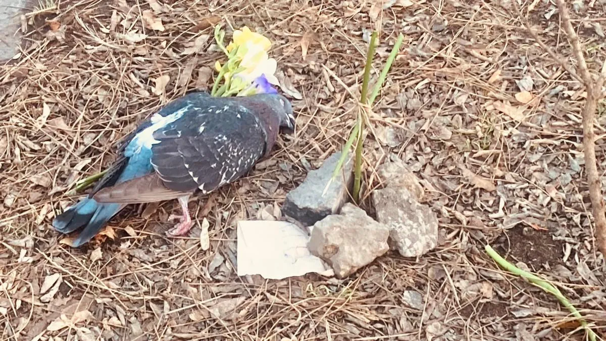 A megosztott képen nem a galambtetem a legérdekesebb, hanem a körülötte elhelyezett virágok és legfőképpen a búcsúlevél, amit a kövek alá tettek.