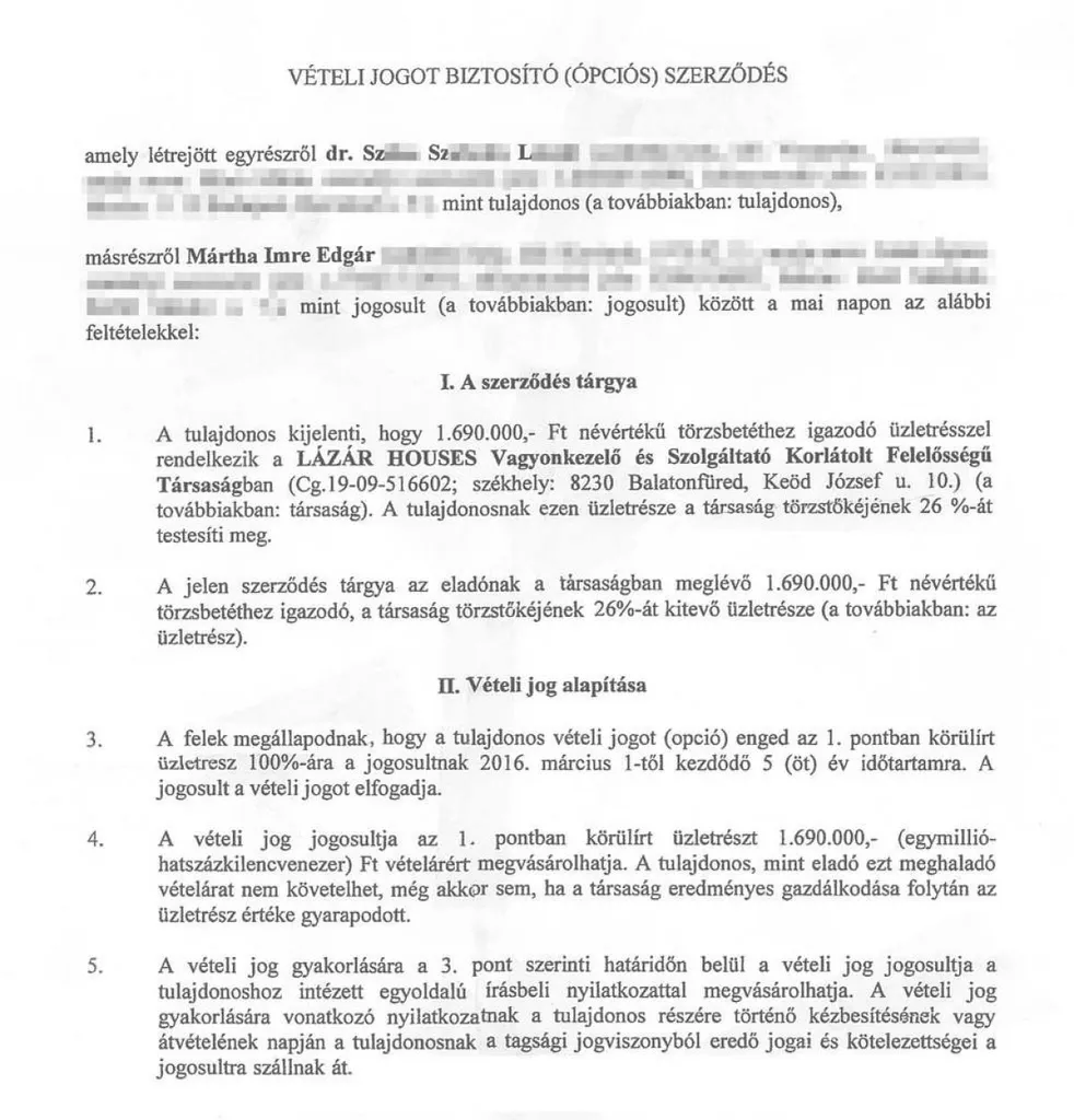 A szerződés szerint a Lázár Houses-ban 26 százalék részesedést tulajdonoló dr. SZ.SZ.L. nevű ügyvéd öt évre, egy meghatározott – valójában nevetségesen alacsony – összegért opciós vételi jogot biztosít erre a tulajdonrészre Mártha Imrének, aki potom 1.690.000 forintért bármikor megvásárolhatja azt. Pontosabban visszavásárolhatja, hiszen a cégtörténet alapján éppen Mártha Imrétől, illetve közvetlen családtagjától „vásárolta”, azaz íratta a nevére az üzletrészt az ügyvéd stróman, így segítve eltüntetni egy hatalmas, milliárdokat érő vagyonrészt.