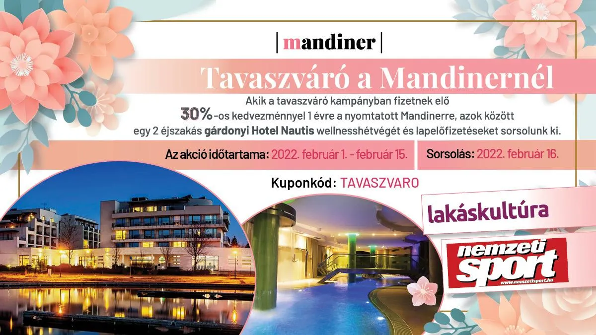Akik a tavaszváró kampányban fizetnek elő 30% kedvezménnyel a Mandinerre, azok között egy 2 éjszakás wellnesshétvégét sorsolnak ki a gárdonyi Vital Hotel Nautisbe 2 éjszakára 2 fő részére, valamint 1-1 egyéves Nemzeti Sport- és Lakáskultúra-előfizetést. A wellnesshétvége utalvány érvényessége: 2022. december 20., kivéve főszezon és ünnepi időszakok.