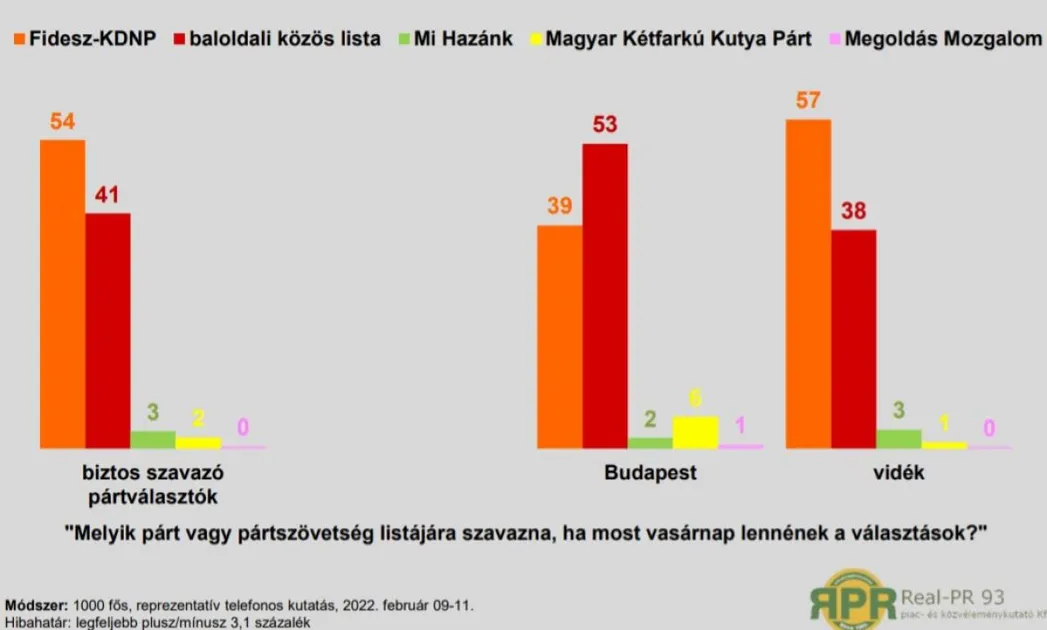 A Real-PR 93. február második hetében végzett kutatása szerint a Fidesz-KDNP továbbra is szignifikáns, azaz a statisztikai hibahatárokat meghaladó különbséggel vezet a baloldal előtt.
